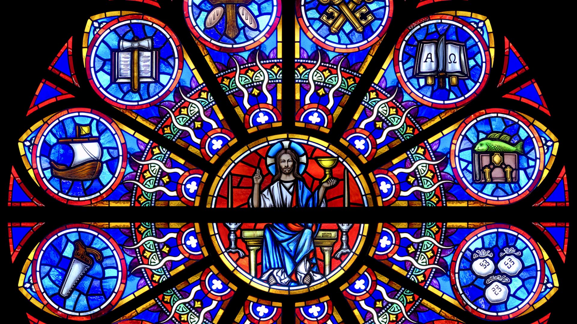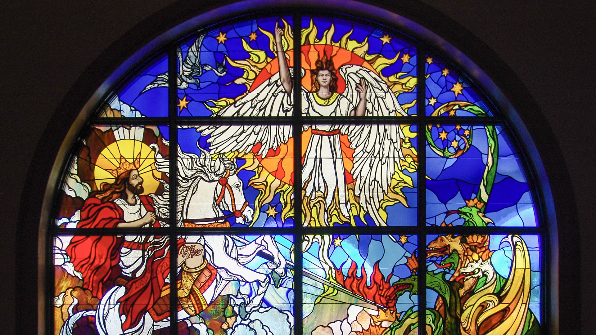 Chancel window, depicting the theme of the resurrection and reign of Jesus Christ.