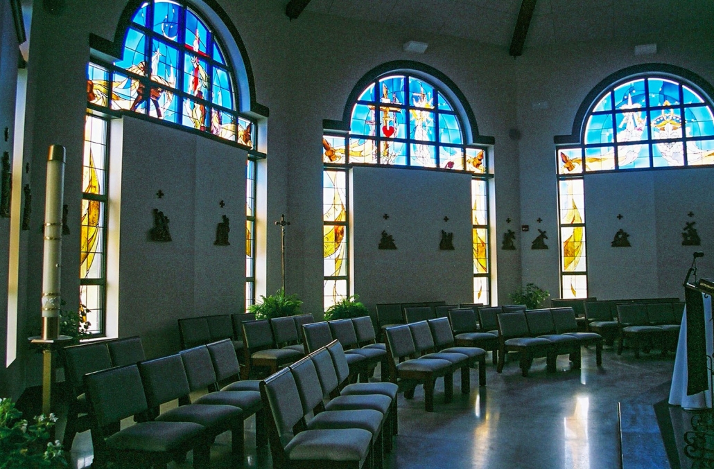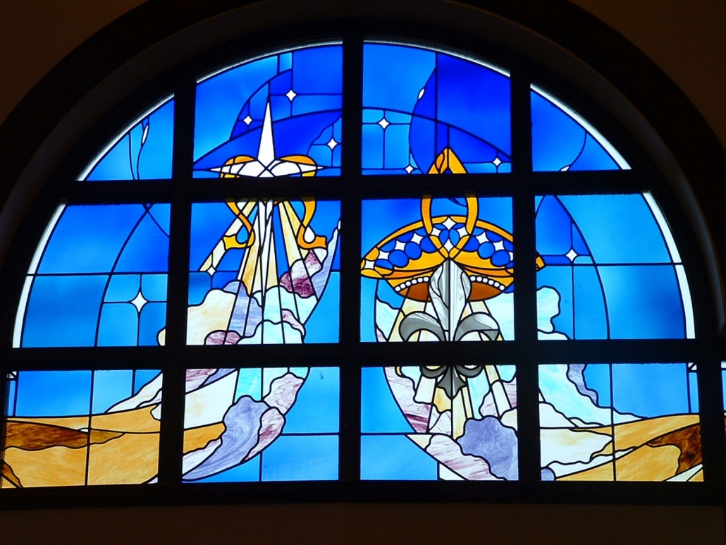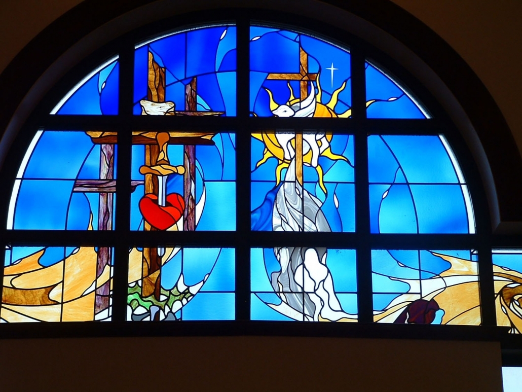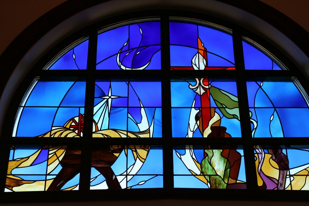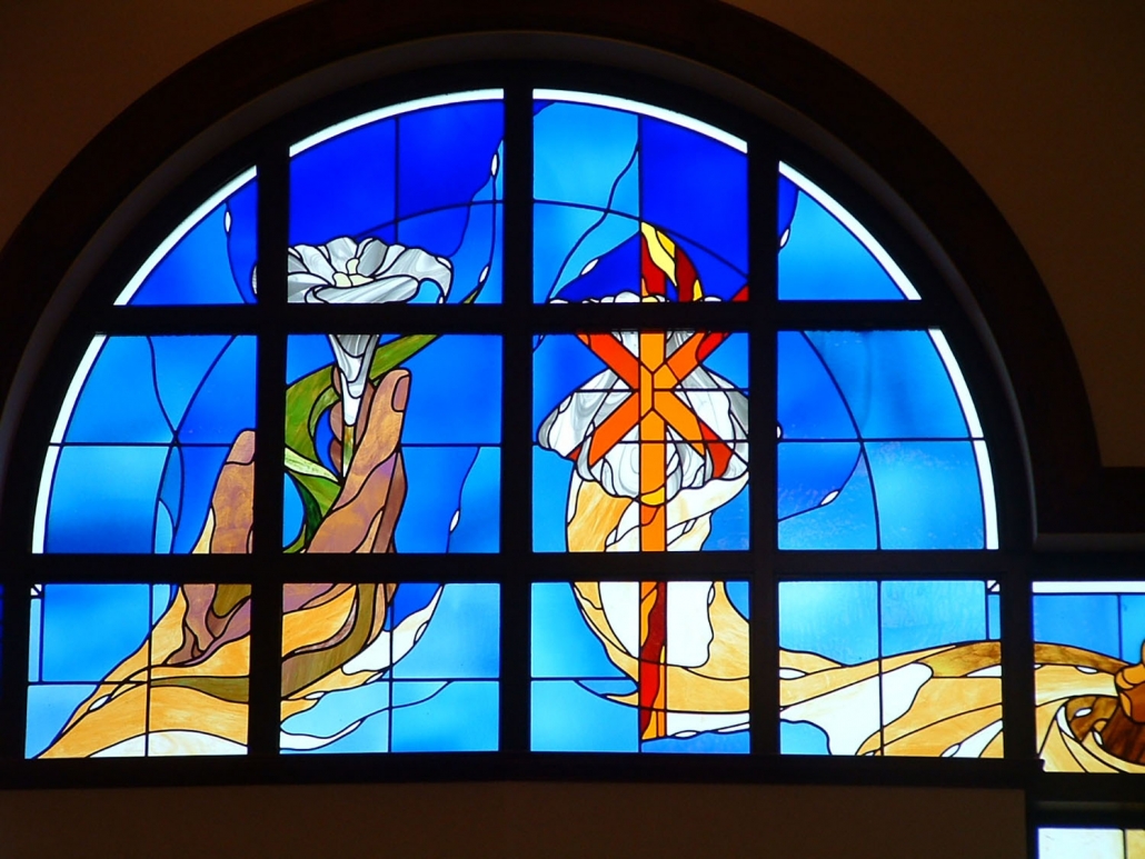 The Crucifixion window separates the church and chapel worship spaces; it is equally beautiful when viewed from either area. The window is crafted largely with clear glass selected in a variety of vision-obscuring textures. The cross is actual wood, and is glazed into the stained-glass panels in the same manner as the stained glass itself.