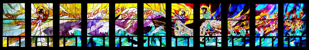The narrative begins near the altar with Christ on the shore. As he calls to the fishermen, His words are caught up in the wind and become intertwined with the nets of Simon Peter and Andrew, forever changing their lives. Andrew is the first to recognize Jesus, and he points out the Savior to his brother, who just begins to look up from his work with a touch of puzzlement in his expression. Flowing colors begin to form auras around the brothers as they heed Jesus’ call, and their nets become purely symbolic, revealing how the two disciples will catch other souls out of a sea of darkness and confusion. The faces of those being saved vary from fully illustrated to merely suggested, indicating that these souls are past, present, and future, and are being guided toward the “Light of the World.”